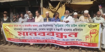বৃহস্পতিবার ২৮ নভেম্বর দুপুরে কুড়িগ্রাম পৌর বাজার মুল সড়কে ঘন্টাব্যাপী এ মানববন্ধন করেন ব্যবসায়ীরা।মানববন্ধন শেষে কুড়িগ্রাম পৌরসভা ও জেলা প্রশাসক বরাবর স্মারকলিপি প্রদান করেন তারা।